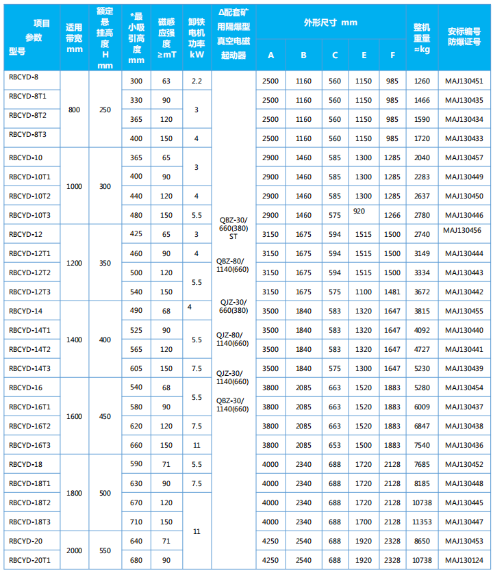 四、RBCYD系列隔爆型永磁除鐵器主要技術參數、外形尺寸  執行標準:GB3836-2010、Q/321191ACL002